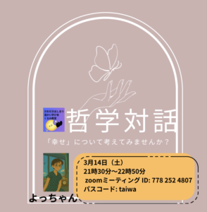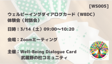 開催スケジュール 3月14日(土) 07:30~08:50 09:00~10:20 WS081大人のための絵本時間とマインドフルネス 絵本からひろがる、輝く小さな気づきたち WS005 幸せの四因子ウェルビーイングダイアログカード(WBDC)体験会(対話会) 10:30~11:50 WS069 ベネッセ高等学院ウェルビーイング研究部「ネガティブな経験を人生のスパイスにするコツ」研究発表 [WS132] 50代からの幸せなシニアのはたらきかた~ミドルシニアの方へ~ WS104 悩みスッキリ!HAPPY!大人のクラス会議 【WS053】1年ぶりの答え合わせ。幸せを探す僕らから、幸せを生きてる天才へ WS028 可能性と才能を再起動させる若返り健康体 12:30~13:50 【WS133】はたらきながら“無理なく”投資<実践編> WS089 顧客・チーム・ビジネス、みんながハッピーになる日本由来の働き方を学ぶWS 14:00~15:20 WS131 つい頑張りすぎちゃう人へ。『成功より深く休むことが、幸せへの近道』〜元全日本代表アスリート・AI Leader of the Year ・ 国際弁護士が語る、AI時代の幸せ〜 【WS134 】営業歴14年!「自己犠牲」を「自己決定」に変える方法 WS068 3/14 世界中の人と巨大花畑を作ろう! -あいの花を描こう- 15:30~16:50 17:00~18:20 18:30~19:50 WS059 ねこの聴き手 ~こころのサウナ~ 20:00~21:20 WS101 多世代交流をパターン・ランゲージで語ってみよう WS043 よるの音楽ブカツ ~ゆるく話そう、音のしあわせ~ WS011 働きながら、ちゃんと幸せになる方法 WS019 反応から自由になる 〜 ストレスと感情に向き合うマインドフルネス瞑想 21:30~22:50 WS103 「幸せ」について考えてみませんか?~HAPPY!哲学対話~ 開催スケジュール 2026年3月13日(金) 2026年3月14日(土) 2026年3月15日(日) リアル開催 @武蔵野キャンパス2026年3月15日(日) 2026年3月16日(月) 2026年3月17日(火) 2026年3月18日(水) 2026年3月19日(木) 2026年3月20日(金・祝) 2026年3月21日(土) 学生企画『ビーフェス2026』 @武蔵野キャンパス2026年3月21日(土) 2026年3月22日(日) 基調講演・シンポジウム@有明キャンパス