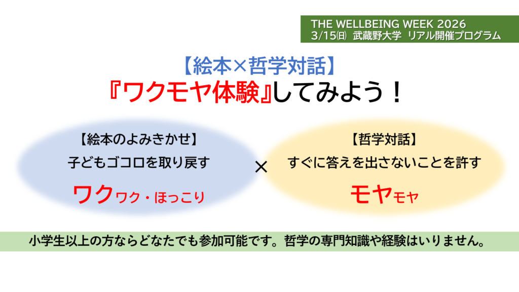 絵本の読み聞かせと哲学対話を組み合わせたワークショップです。一冊の絵本を題材に参加者同士で問いを立てて、みんなで対話をしながらその問いを深めていきます。これまで都内を中心に開催を重ね、絵本の楽しさとみんなで対話するおもしろさが体験できたと好評を得ており、今回、THE WELLBEING WEEK 2026でも実施することになりました。