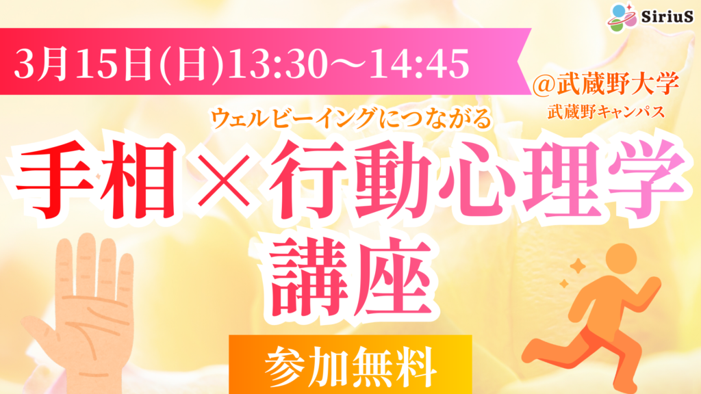 今回のイベントでは金運、健康運、人間関係運など運気を整える手相の見方を、わかりやすくお伝えします。