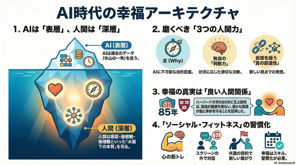 80年超に及ぶハーバード成人発達研究が導き出した「幸せの正体」を、AI時代の視点から再定義します。