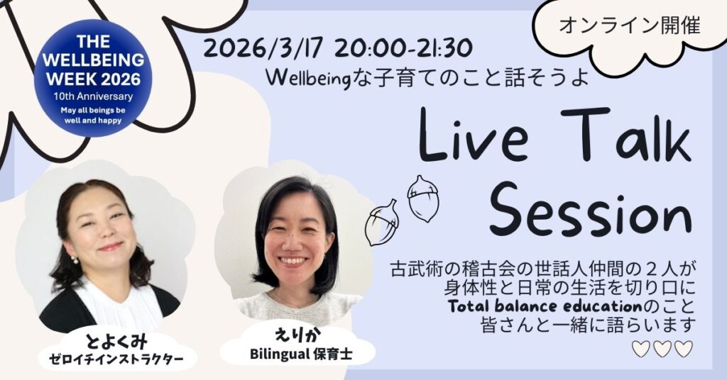 力みを抜くことや心身一如であることをお教室や稽古場で学びながら、子育てに身体性という切り口を取り入れることをお伝えしたり、対話的に学び合う場を企画運営してきた二人が、Wellbeing Week 2026にて対話の時間をファシリテートいたします。